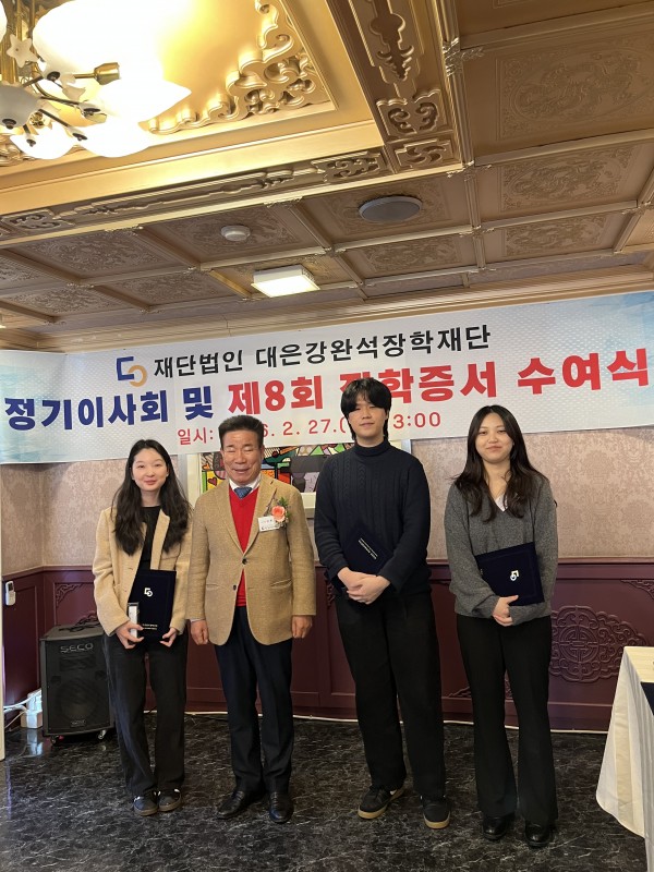 8회_2026년 대은강완석장학재단 제8회 장학증서 수여식 페이지 정보 작성자 대은강완석장학재단 댓글 0건 조회 3회 작성일 26-03-03 13:51 본문 대은강완석장학재단 제8회 장학증서 수여식입니다. 장학생 선발을 진심으로 축하 드립니다. 목록 댓글목록 댓글목록 등록된 댓글이 없습니다.
